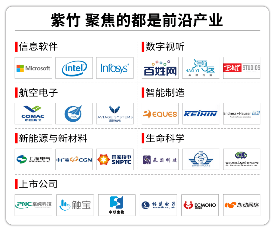 紫竹聚焦“集成电路与软件、新能源、航空航天、智能制造、数字视听、生命科学”六大前沿赛道, 微软、英特尔、可口可乐、晟碟半导体、 印孚瑟斯技术、东软集团、 中国商飞等都多家世界500强进驻。