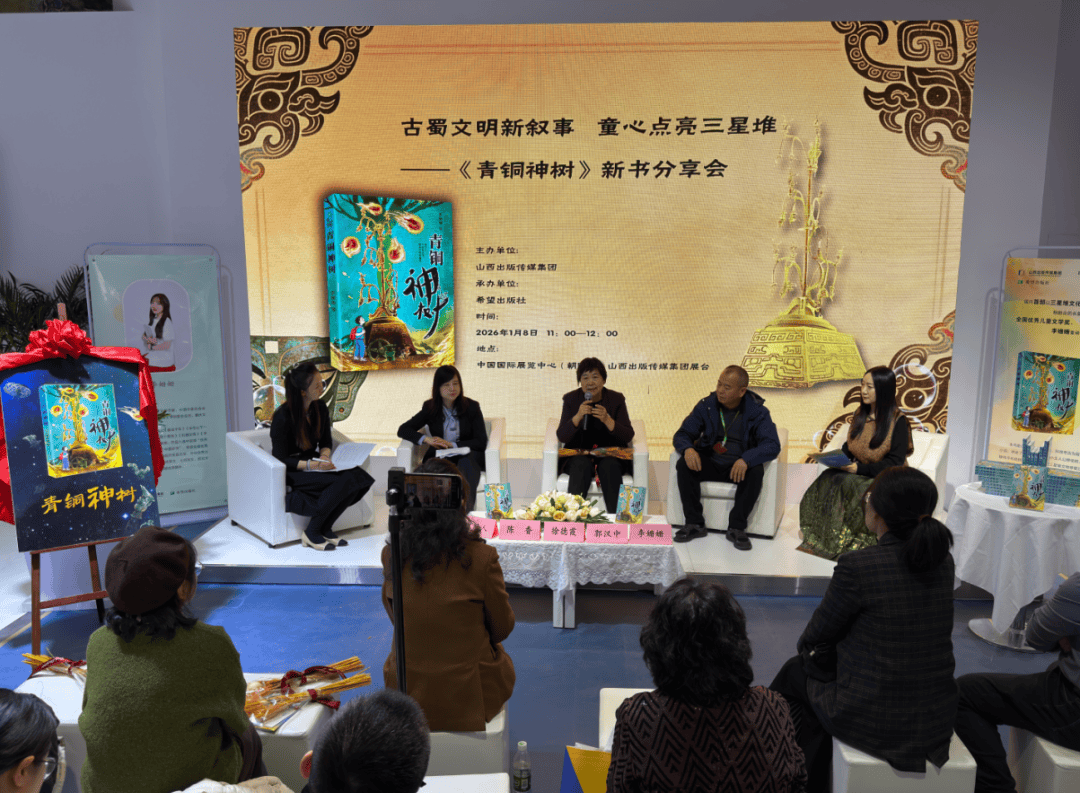 1月8日,由山西出版传媒集团主办、希望出版社承办的“古蜀文明新叙事 童心点亮三星堆——《青铜神树》新书分享会”在中国国际展览中心山西出版传媒集团展台举办。四川省文物局局长、四川省文物考古研究院原院长、三星堆遗址考古发掘总领队唐飞,《儿童文学》杂志原主编、中国作协儿童文学委员会委员徐德霞,《中华读书报》总编助理、中国儿童文学研究会副秘书长、浙江师范大学儿童文学研究中心特聘研究员陈香,三星堆博物馆文物保管部副部长、副研究员郭汉中,山西出版传媒集团党委委员、副总经理、总编辑孟绍勇,山西出版传媒集团党委委员、副总经理兼希望出版社党支部书记、社长、总编辑王琦,山西出版传媒集团副总经理、总会计师王瑞霞,山西省委宣传部二级调研员毛月,山西省出版工作者协会副会长兼秘书长焦团平,《青铜神树》作者李姗姗等出席活动。