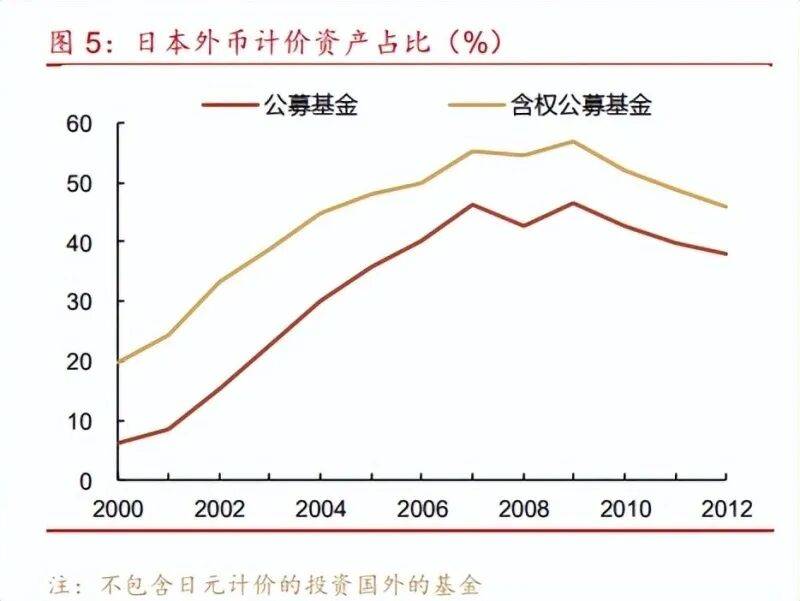 日本的公募投资信托基本可对标国内市场的公募基金,主要分为债券型和权益型 两大类,根据投资信托协会的规定,可以配置股票的投资信托均被归入权益型产品。 为了方便理解,我们在下文中分别将这两类投资信托称为含权基金和债券基金。 在日本股价下跌、政策利率趋零的背景下,公募基金快速发展,重点增配海外 资产。2000-2012 年,日本政策利率趋零,10 年期国债利率在 1.5%附近震荡,同期美欧等国家的长期利率,在 2008 年新一轮全球降息周期开启前,基本维持在 3%以 上,高票息的海外债券成为日本机构提供了增厚收益的重要工具。期间,公募基金净 资产中外币计价资产所占的比例迅速上升,在 2009 年末达到 46.5%的高点。虽然 2010 年之后占比有所下降,但由于日元计价基金持有的外币计价证券未被纳入统计, 因此实际的外币计价证券比例可能更高。 日本含权基金的外币计价资产中,债券是主要配置方向。从含权公募基金投资 标的的净值分布来看,零利率时期的尾声 2012 年,海外资产占比(55.6%)明显高 于国内资产(21.3%),其中海外债券是净值占比最高的资产,达 38.0%。 与此同时,日股剧烈波动相对平息的阶段,基金对含权资产的配置比例显著提 升。2000 年以来,随着日股触及谷底,含权基金规模不断扩张,在市场的占比也持 续提升,投信机构增配含权资产。我们对含权基金的持仓进行拆分,来侧面观察固收 +产品的规模变动。2000 年至 2010 年期间,股票型基金规模整体呈现上升趋势,然 而其股票仓位却持续下降。这或许是由于仅投资股票的基金规模减少,而投资多资产 的产品规模扩张。与此同时债券持仓大幅增加,或说明固收+基金规模增加,承接了 部分从“纯股票”基金中流出的资金。