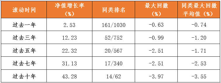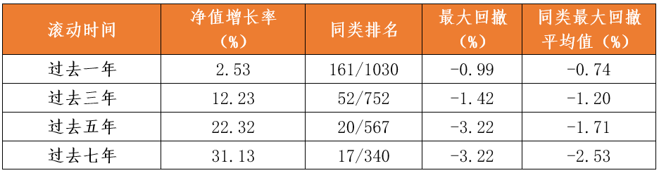 备注:基金净值增长率、业绩排名、最大回撤、同类最大回撤平均值等数据来源银河证券基金评价中心,公司固收类基金超额收益数据来源于国泰海通证券《基金公司权益及固定收益类资产超额收益排行榜》,数据截至2026年3月31日。固收类大型基金公司分类按照海通证券规模排行榜近一年主动固收的平均规模进行划分,按照基金公司规模自大到小进行排序,其中累计平均主动固收规模占比达到全市场主动固收规模50%的基金公司划分为大型基金公司。基金管理公司超额收益是指基金公司管理的主动型基金超额收益(基金净值增长率减去业绩比较基准后的收益)按照期间管理资产规模加权计算的平均超额收益